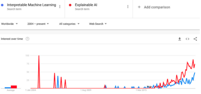 从那以后的几年,根据Google上“可解释性机器学习”和“可解释的AI”这两个搜索词的出现频率,可以大概得出IML领域在2015年才真正起飞。