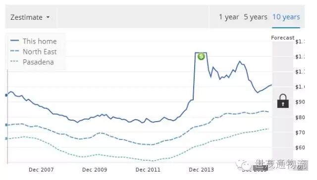最下方的点状线是帕萨迪纳(Pasadena)城市的平均房价,中间一条虚线是王宝强购置房产的区域North East的平均房价,最上方一条实线是王宝强所购房产,市场估值的变化趋势。