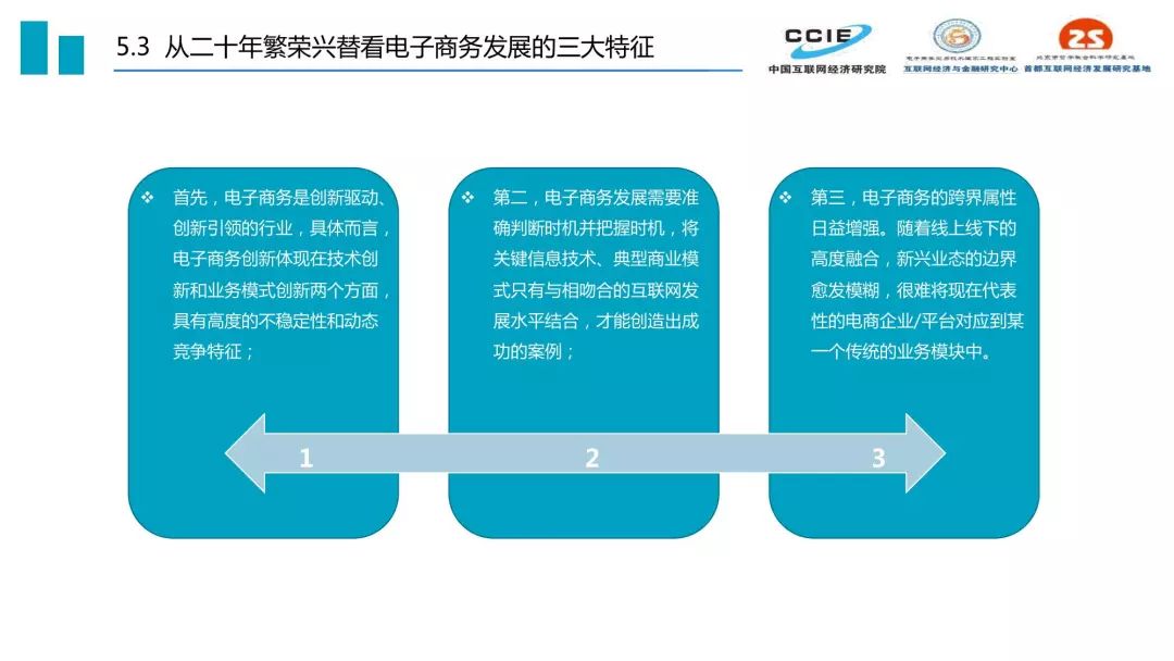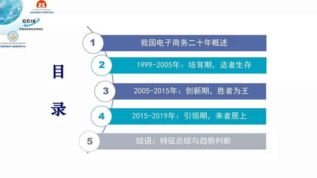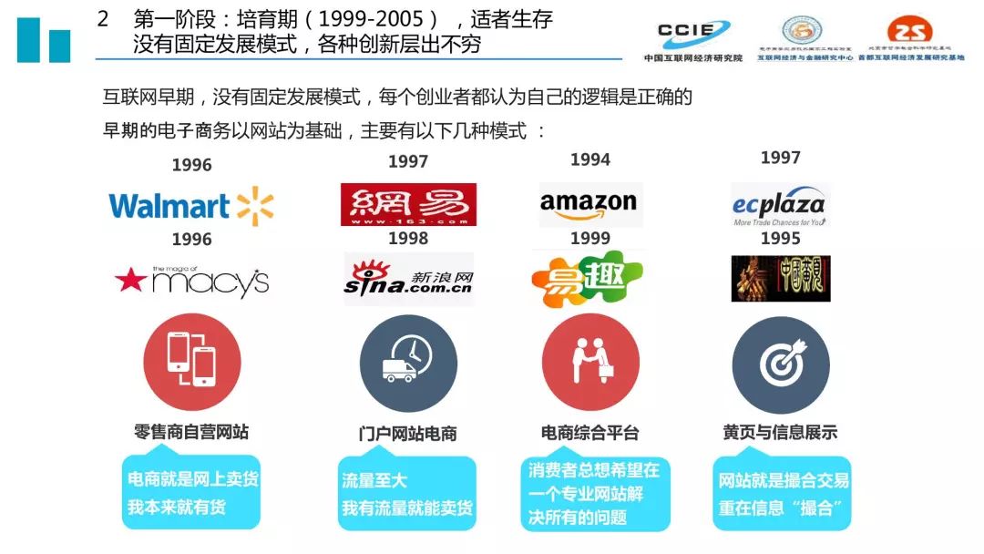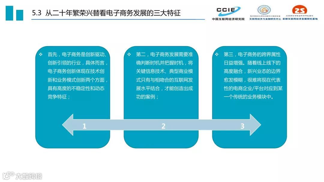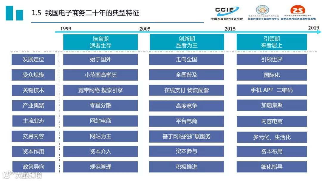 过去二十年,我国电子商务发展历程可分为三个阶段:培育期(1999-2005)、创新期(2005-2015)和引领期(2015-2019)。三个时期的核心特征分别是适者生存、胜者为王、来者居上,在发展定位、受众规模、关键技术、产业集聚、主流业态、交易内容和资本作用方面都呈现出鲜明的时代印记。