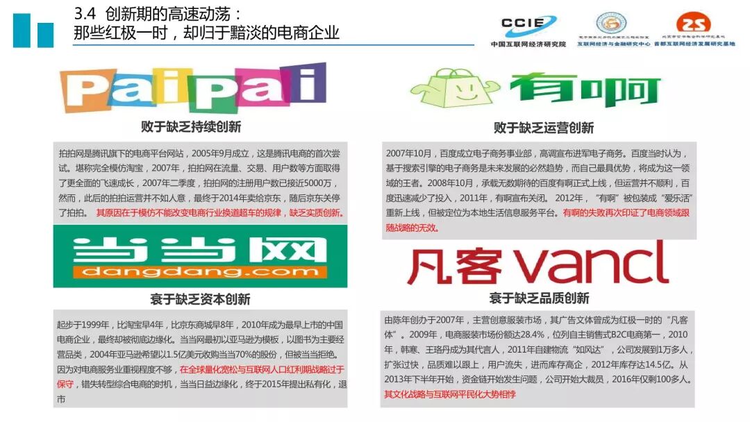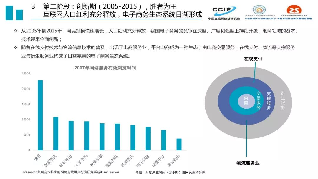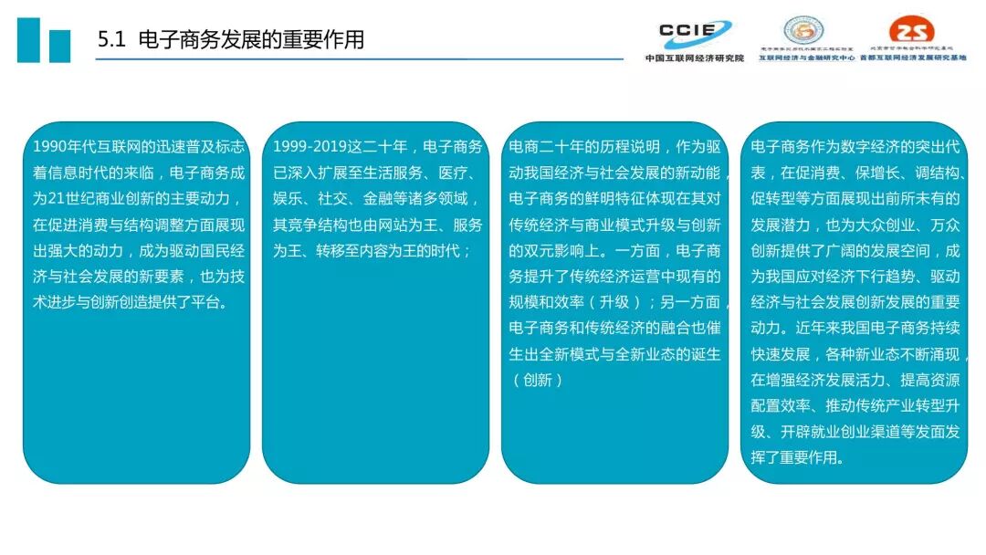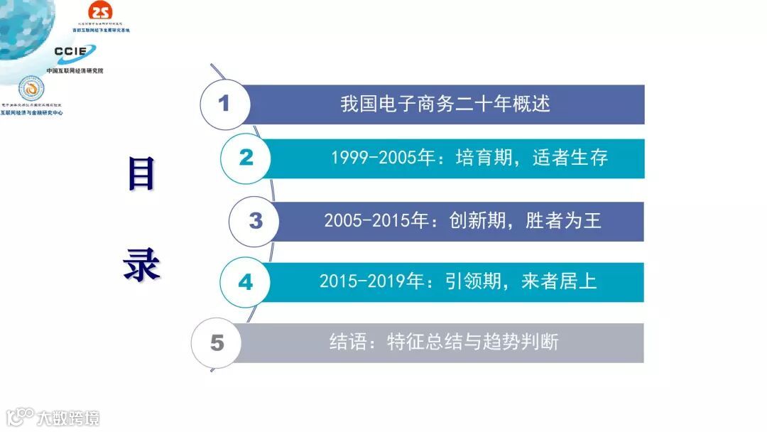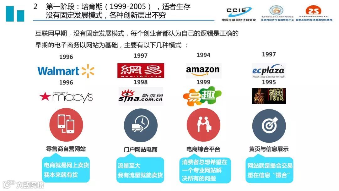 过去二十年,我国电子商务发展历程可分为三个阶段:培育期(1999-2005)、创新期(2005-2015)和引领期(2015-2019)。三个时期的核心特征分别是适者生存、胜者为王、来者居上,在发展定位、受众规模、关键技术、产业集聚、主流业态、交易内容和资本作用方面都呈现出鲜明的时代印记。