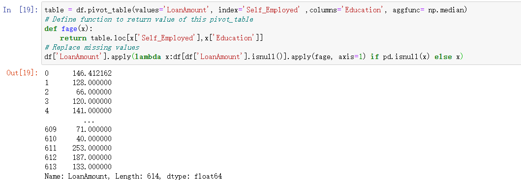 现在,我们来创建一个数据透视表,该表为我们提供Self_Employed和Education的所有唯一值组的中值。然后我们定义一个函数,返回单元格值并用其填补贷款金额的缺失值: