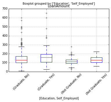 我们可以看到每组贷款金额的中位数有些变化,这可以用来估算该值。但首先,我们必须确保Self_Employed和Education这两个变量都不应该有缺失值。