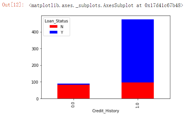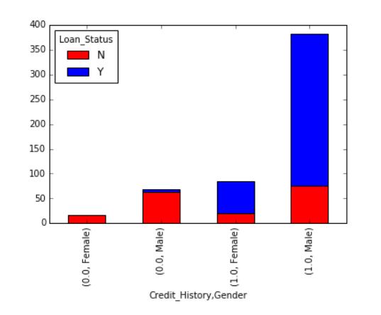 从上图中我们可以看出,如果贷款申请人具有良好的信用记录,其获得贷款的机会会提升8倍。同样,我们还可以根据申请人是否已婚、是否自雇人士、所在地区等来绘制类似的图。此外,我们也可以把这两个图组合成一个堆叠图来展现相同的数据效果: