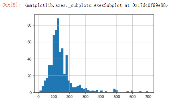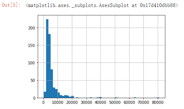 我们可以观察到上图中的极值很少。这也是为什么在代码中bins要设置为50才能清楚地描述该数据分布的原因。