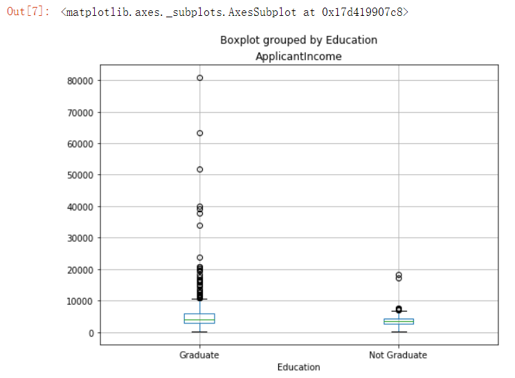 上图表明ApplicantIncome字段中存在许多异常值或极值。这可以归因于社会上存在的收入差距,部分原因可能是我们的数据样本有不同学历背景。下面让我们对学历进行划分: