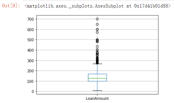 可以看到该字段中也有一些极值。显然,ApplicantIncome和LoanAmount字段都需要进行一定的数据整理。LoanAmount字段有缺失值和极值,而ApplicantIncome字段则有几个极值,这需要进行更深入的分析处理,我们将在后面的内容中讨论这个问题。