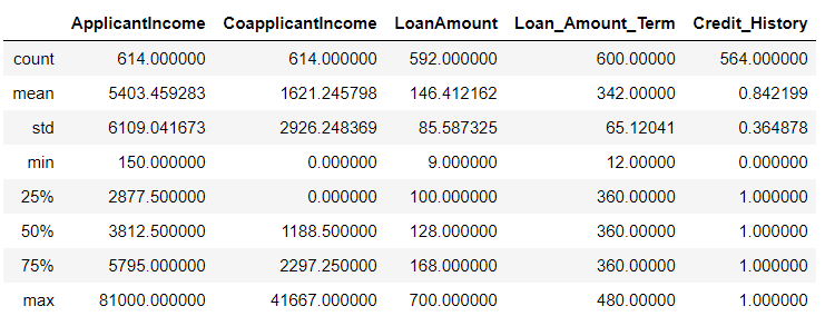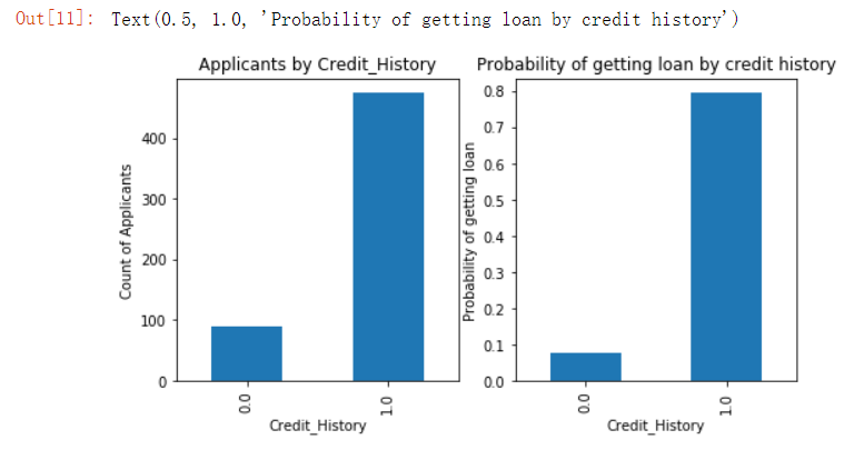大约84%的申请人有credit_history。本结论可由Credit_History字段的平均值为0.84得出(对于拥有信用记录的用户,规定Credit_History的值为1,否则为0)