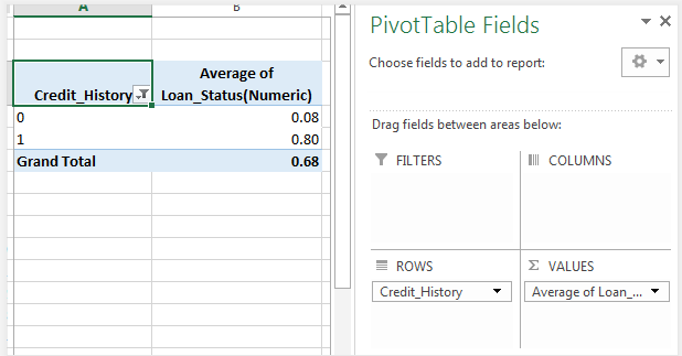 我们先使用Excel中的数据透视表和交叉表。例如,要根据申请者的信用历史记录查看他能获得贷款的概率,我们可以在Excel中使用数据透视表如下实现: