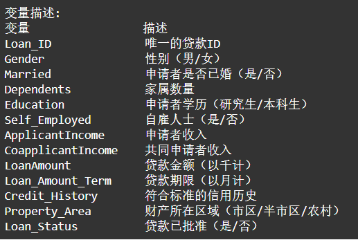 本次我们使用的是Analytics Vidhya竞赛贷款预测问题中的数据集,其变量描述如下: