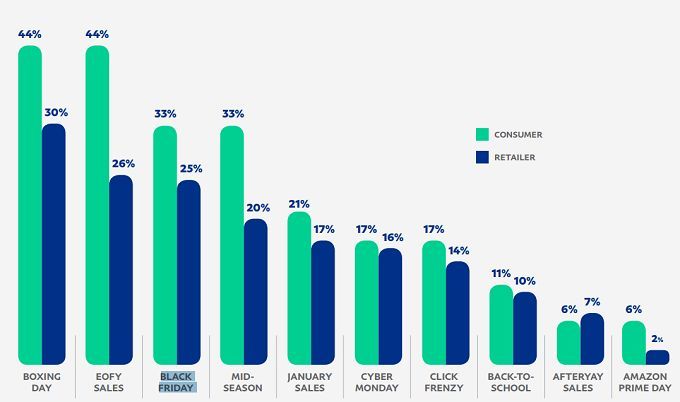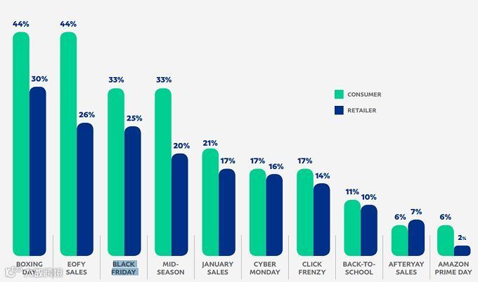 有趣的是,PayPal发现,澳大利亚传统零售节日比起新兴的美国购物节还更受消费者欢迎。如下图所示,澳大利亚消费者在Boxing Day(节礼日)和EOFY Sales(年底欢乐购)等大促时期的参与度均达到了44%,在黑五和网一时期则分别为33%和17%。