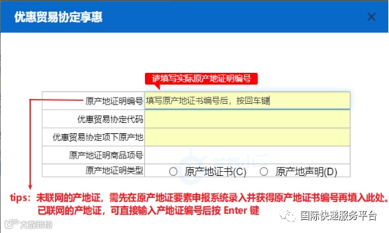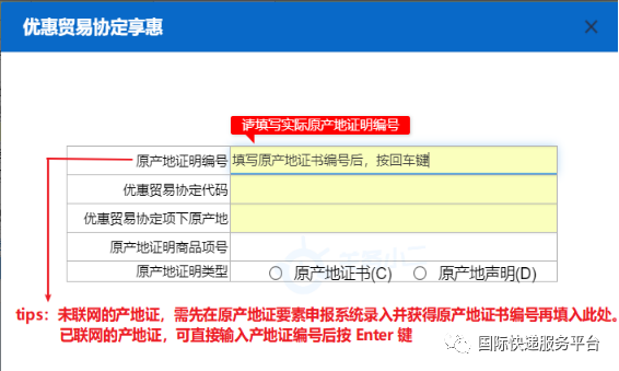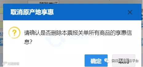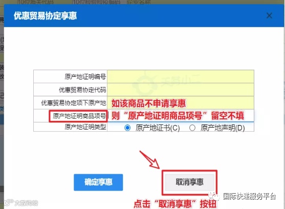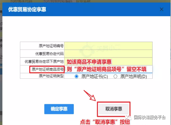 注意:如该商品不申请享惠,则“原产地证明商品项号”留空不填。点击“取消享惠”按钮会取消该条商品与原产地证明的对应关系。