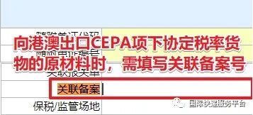 注意:向香港或者澳门特别行政区出口用于生产《内地与香港关于建立更紧密经贸关系的安排》(香港CEPA)或者《内地与澳门关于建立更紧密经贸关系的安排》(澳门CEPA)项下协定税率货物的原材料时,应当在《报关单》的“关联备案”栏填报香港或澳门生产厂商在香港工贸署或者澳门经济局登记备案的有关备案号。
