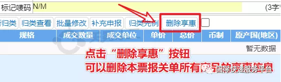 四、通过商品表体上方功能栏“删除享惠”按钮,可以删除本票报关单所有商品的享惠信息。