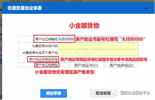 三、 小金额货物:原产地证书编号栏填写“XJE00000”,原产地证明商品项号栏目填报本报关单中该商品的项号,小金额货物无需填报原产地类型。
