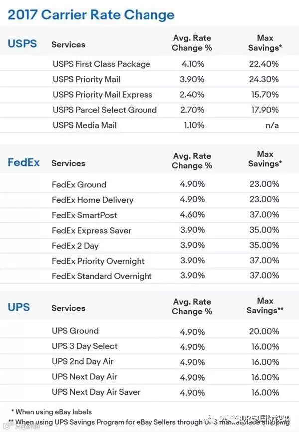 据了解,UPS(联合包裹服务公司)、FedEx(联邦快递)和USPS(美国邮政服务公司)已经公告,他们将上调2017年的资费费率,新的资费费率将于下列日期正式生效: