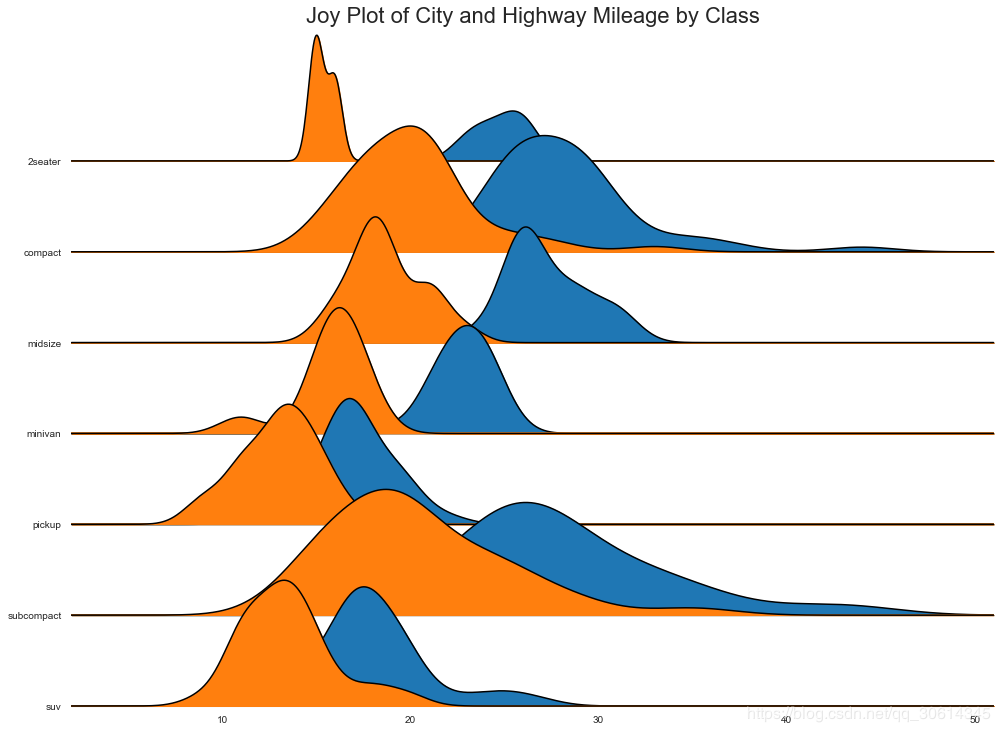 plt.title('Joy Plot of City and Highway Mileage by Class', fontsize=22)