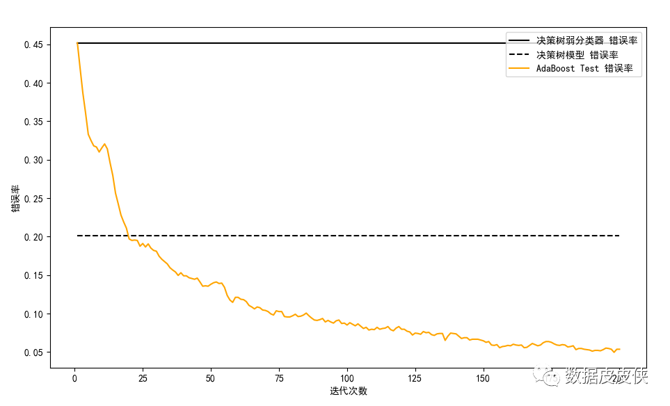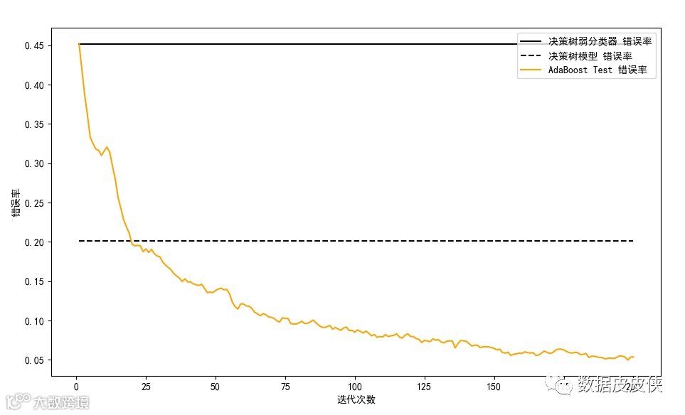 78ax.plot([1,n_estimators],[dt_stump_err]*2, 'k-', label=u'决策树弱分类器 错误率')