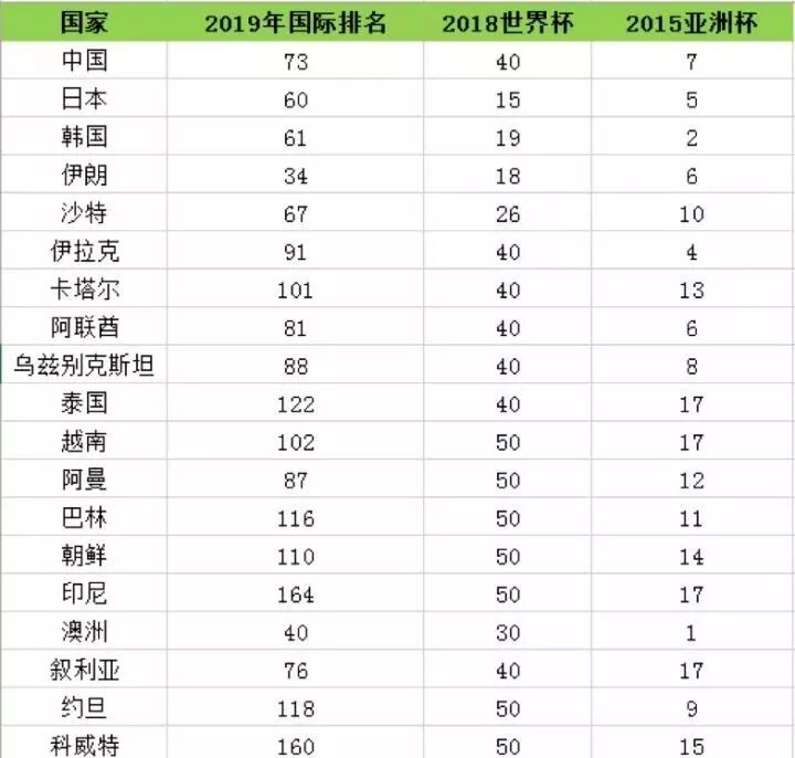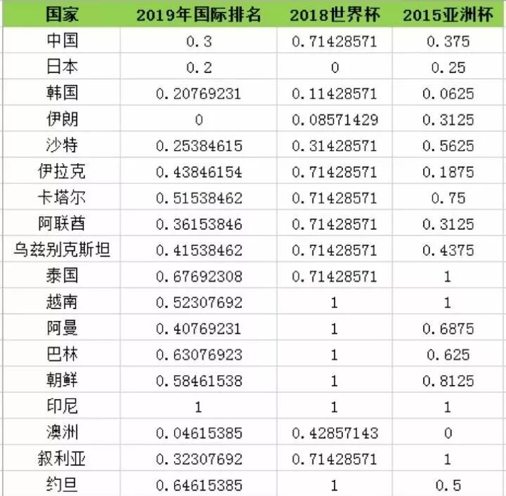 其中 2019 年国际足联的世界排名,2015 年亚洲杯排名均为实际排名,2018年,很多球队没有入围决赛,进入决赛圈的有自己的排名,没有进入决赛圈我们按照以下原则来给其一个排名: