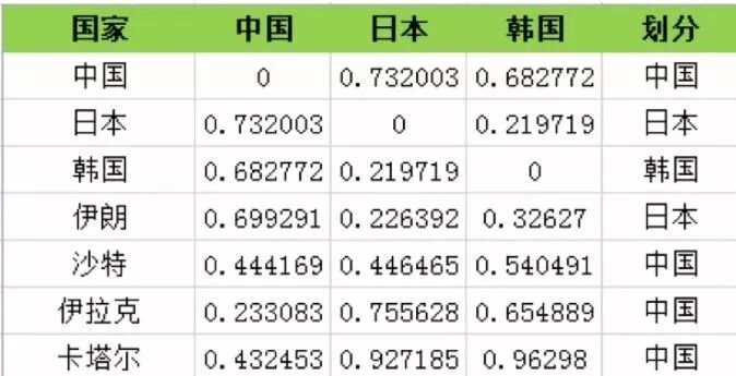 采用欧式距离,默认19年,18年,15年的数据权重是一样的,比如中国与日本的距离: