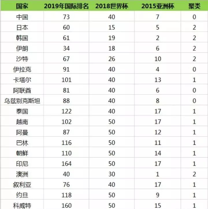 国家 2019年国际排名 2018世界杯 2015亚洲杯 聚类