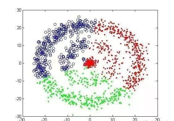 算法本身的局限性:对于类似下面圆形的数据集,聚类效果很差,主要是算法原因。所以还有其他的聚类算法,比如基于密度的方法等。