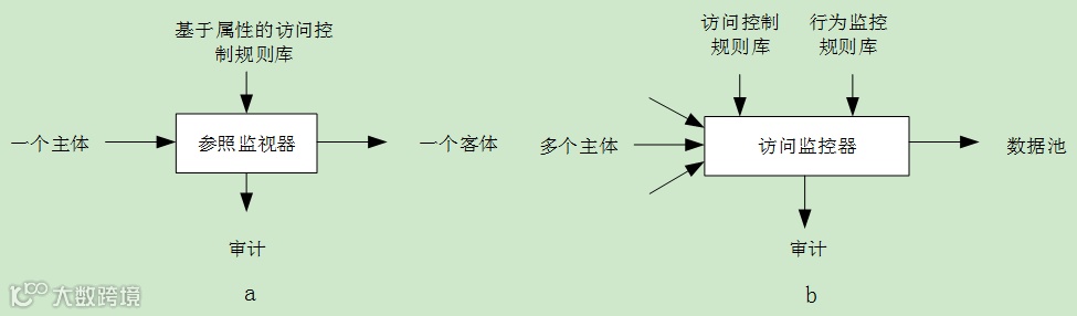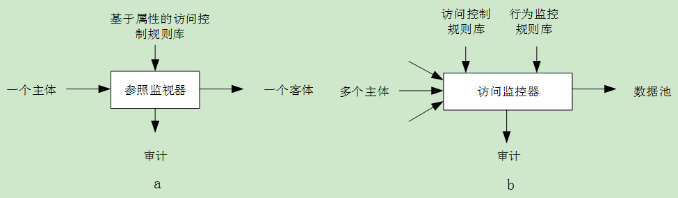 在将数据作为资产进行保护的情形下,计算环境中一个非常重要的安全模块是访问监控器[参考资料4],这是在操作系统安全子系统的核心,许多应用程序,也会参考这个模型进行设计具体应用的访问控制问题。如图2a,但是这个访问监控器,只能做到一个主体访问一个客体,而对于将数据作为生产要素的生产过程,这个访问监控器将无法完成相应的监控和授权机制。为此笔者提出了图2b的思路。