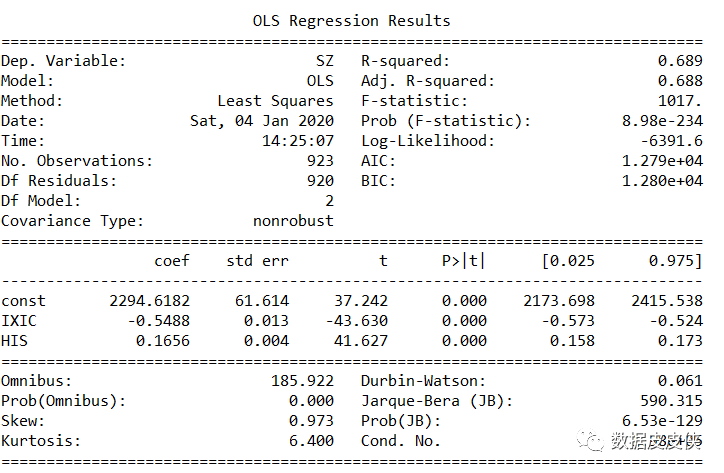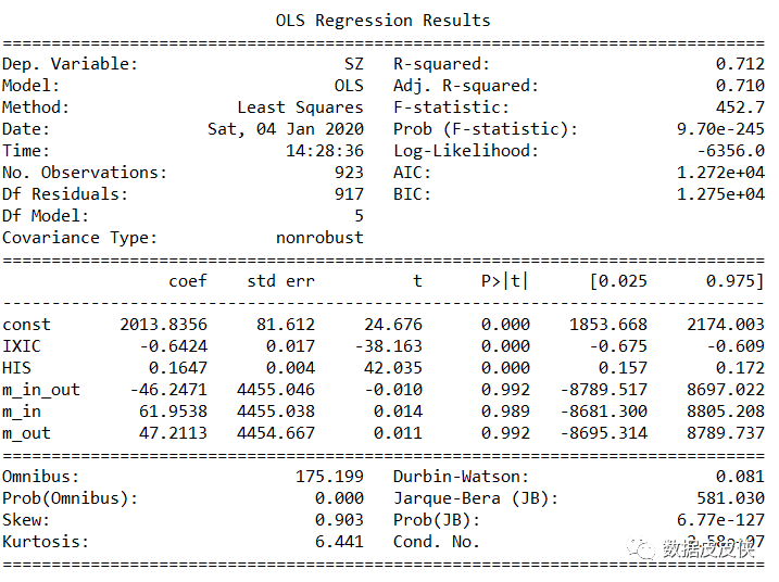 进行最小二乘法回归发现,纳斯达克指数和港股指数依然会对上证股票市场产生显著的影响,其中纳斯达克指数和上证呈负的相关性,恒生指数则呈正的相关性,这与相关性分析当中的我们的预测基本相符,弱相关性的恒生指数也能显著影响上证指数有些出人意料。同时我们可以在表中发现R方为0.689,这表明纳斯达克指数和恒生指数能解释69%左右的上证指数,这与之前回归中的71%相差无几,可以侧面印证进出口总量对上证市场的影响小,坐实了上述观点。