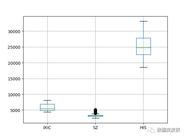 从箱型图2中可以看出,恒生指数的上下四分位数值域约为(22500,27500),值域约为(18500,33000),是三大指数中数值波动最大的一个,同时也是数值最高的。而上证指数则是波动最小的,一直在2900左右波动,这可能一方面是国内股灾后市场热情退却的关系,另一方面是政策求稳支持的原因。而纳斯达克指数也存在较大的波动,作为数值较小的指数,纳斯达克指数的上下四分位数值域约为(5000,7000),值域约为(4500,8000),在波动率是明显大于恒生指数的,也是三者中波动率最大的。从这些数据中,可以分析得知,国内股票市场相对而言是属于较为稳定的,而恒生指数和纳斯达克指数能更好的反应预期之外环境带来的冲击。