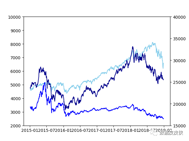 使用python双y轴作图,右侧y轴为恒生指数,左侧y轴对应纳斯达克指数和上证指数,通过不同的值域更好的三者放在一起对比。在图1中可以看出,在2015-2016年股灾期间,上证指数和恒生指数保持了一个非常相似的走向,而在2015年之后可以明显看到上证指数波动不大,整体呈微弱的上升趋势,并在2018年之后逐渐走低,但恒生指数代表的港股却在2016之后一路高涨,直到2018年,或许是受到香港局势的影响,整体快速下滑。与国内的两个指数相比,美股的走向就有较大的区别,纳斯达克指数在2015-2016年只是受到股灾微弱的影响,并没有大幅波动,并在之后以平稳的态势上升直至2018年9月,之后美股经历了较大的滑坡。