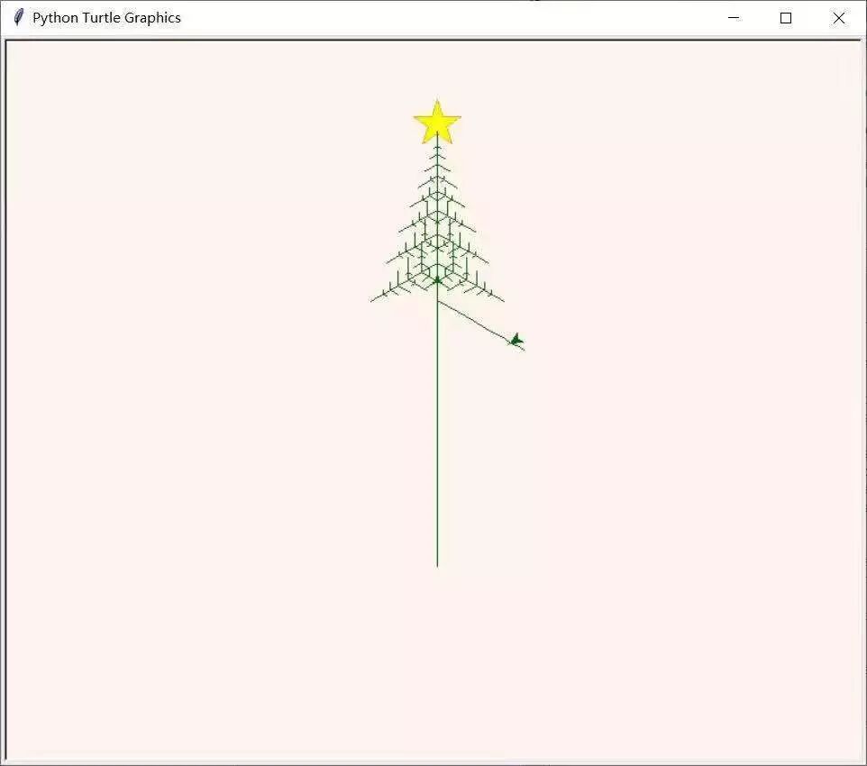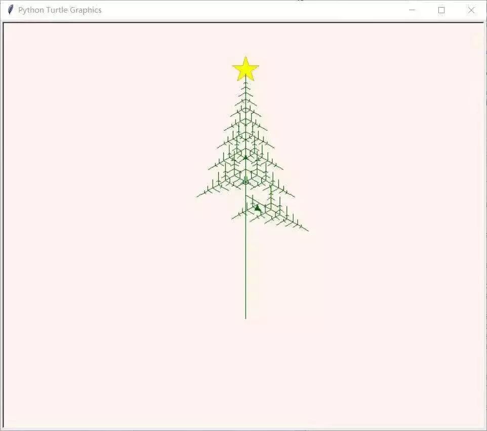from turtle import *import randomimport timen = 80.0speed("fastest")screensize(bg='seashell')left(90)forward(3*n)color("orange", "yellow")begin_fill()left(126)for i in range(5):forward(n/5)right(144)forward(n/5)left(72)end_fill()right(126)color("dark green")backward(n*4.8)def tree(d, s):if d <= 0: returnforward(s)tree(d-1, s*.8)right(120)tree(d-3, s*.5)right(120)tree(d-3, s*.5)right(120)backward(s)tree(15, n)backward(n/2)for i in range(200):a = 200 - 400 * random.random()b = 10 - 20 * random.random()up()forward(b)left(90)forward(a)down()if random.randint(0, 1) == 0:color('tomato')else:color('wheat')circle(2)up()backward(a)right(90)backward(b)time.sleep(60)
