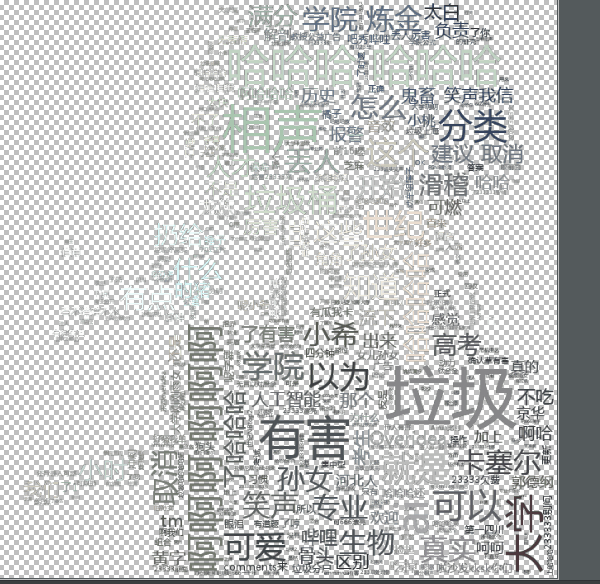 import requestsimport matplotlib.pyplot as pltimport pandas as pdimport jiebaimport tracebackfrom lxml import etreefrom wordcloud import WordCloud, ImageColorGenerator# 获取弹幕数据并保存本地csv文件def getWords2locals(comment_cid):try:# 请求弹幕数据base_url = 'http://comment.bilibili.com/{}.xml'now_url = base_url.format(comment_cid)res = requests.get(now_url)xml_dom = etree.XML(res.content)comment_list = xml_dom.xpath('//d/text()')# 解析弹幕数据comments = [comment for comment in comment_list]comments_dict = {'comments': comments}# 将弹幕数据保存在本地br = pd.DataFrame(comments_dict)wordFile_name = str(comment_id) + '.csv'br.to_csv(wordFile_name, encoding='utf-8')# 调用制作词云的函数makeWordClound(wordFile_name)except:print('获取弹幕数据发生错误', traceback.format_exc())# 读取得到的弹幕并制作词云图def makeWordClound(wordFileName):try:# 加载背景图mask_img = plt.imread('timg.jpg')'''设置词云样式'''wc = WordCloud(# 设置字体font_path='/Users/zhanghuining/Desktop/msyh.ttf',# 允许最大词汇量max_words=200000,# 设置最大号字体大小max_font_size=80,# 设置使用的背景图片mask=mask_img,# 设置输出的图片背景色background_color=None, mode="RGBA",# 设置有多少种随机生成状态,即有多少种配色方案random_state=30)# 读取文件内容br = pd.read_csv(wordFileName, header=None)text = ' 'for line in br[1]:text += ' '.join(jieba.cut(line, cut_all=False))# 打印用于制作词云的字符串print(text)# 生成词云wc.generate_from_text(text)# 改变字体颜色img_colors = ImageColorGenerator(mask_img)# 字体颜色为背景图片的颜色wc.recolor(color_func=img_colors)# 显示词云图plt.imshow(wc)# 关闭坐标轴plt.axis('off')# 将图片保存到本地clound_id = wordFileName.split('.')[0]wordClound_name = clound_id + '.png'wc.to_file(wordClound_name)print('生成词云图成功!')except:error = traceback.format_exc()print('制作词云图片时发送错误 ---错误信息', error)if 'cannot open resource' in error:print('可能是font_path参数错误,请设置当前系统中已有的字体,并且是支持中文的')if __name__ == '__main__':# 99768393---->弹幕idcomment_id = input('请输入弹幕id:')getWords2locals(comment_id)