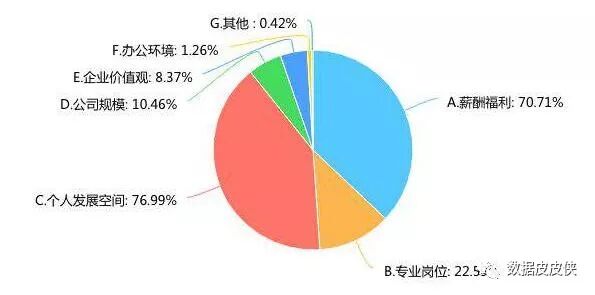 除了百度,很多学生也表示非常看好华为的未来发展。从问卷结果来看,70.71% 的被访者将「薪酬福利」作为了优先考虑的因素之一;这也正与前段时间华为天价聘请博士的热点相契合。不过,在「个人发展空间因素」的考量上,有 76.99% 的被访者认为这一点更加重要。