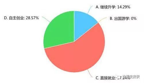 调查结果显示,66.53% 的被访者打算大学毕业后直接就业,而 31.8% 的人选择继续升学,剩下的 1.68% 可能会出国游学或自主创业。从这一结果可以看出,越来越多人更加注重个人的文化水平,预计考研压力依然会逐年上升。