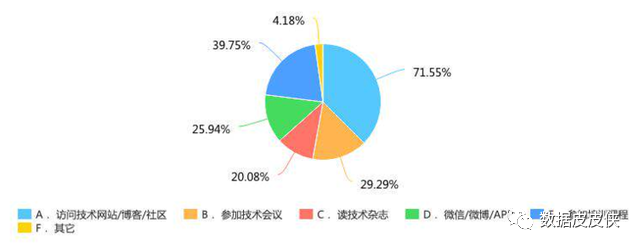 在提升个人能力的方式一问中,大部分人通常都会选择通过访问技术网站/博客/社区来进行学习,也有接近 40% 的人会通过参加培训课程进行自我提升,还有一部分人会选择参加技术会议、读技术杂志、微信/微博/APP 的形式来实现个人能力的提升。