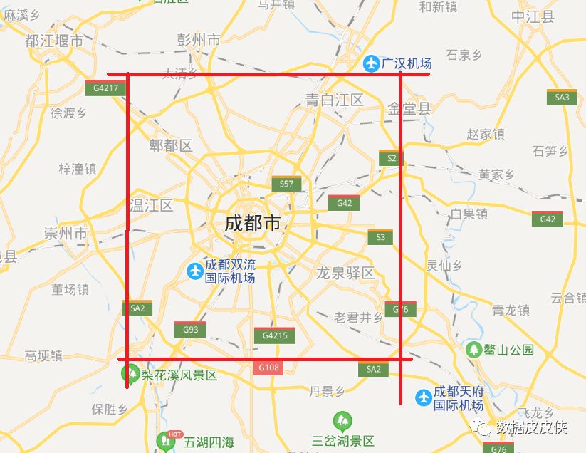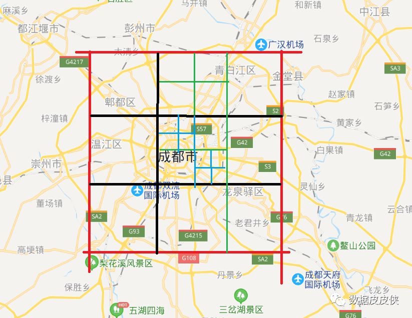 由于百度地图数据访问方式的限制,我们每次访问只能得到最多400个数据,且以矩形选区方式返回对应区域的数据,因此我们需要对成都市进行大致的选区划分,以大致的矩形框选成都市并且对成都市进行更加细致的网格划分以实现数据的完整获取。