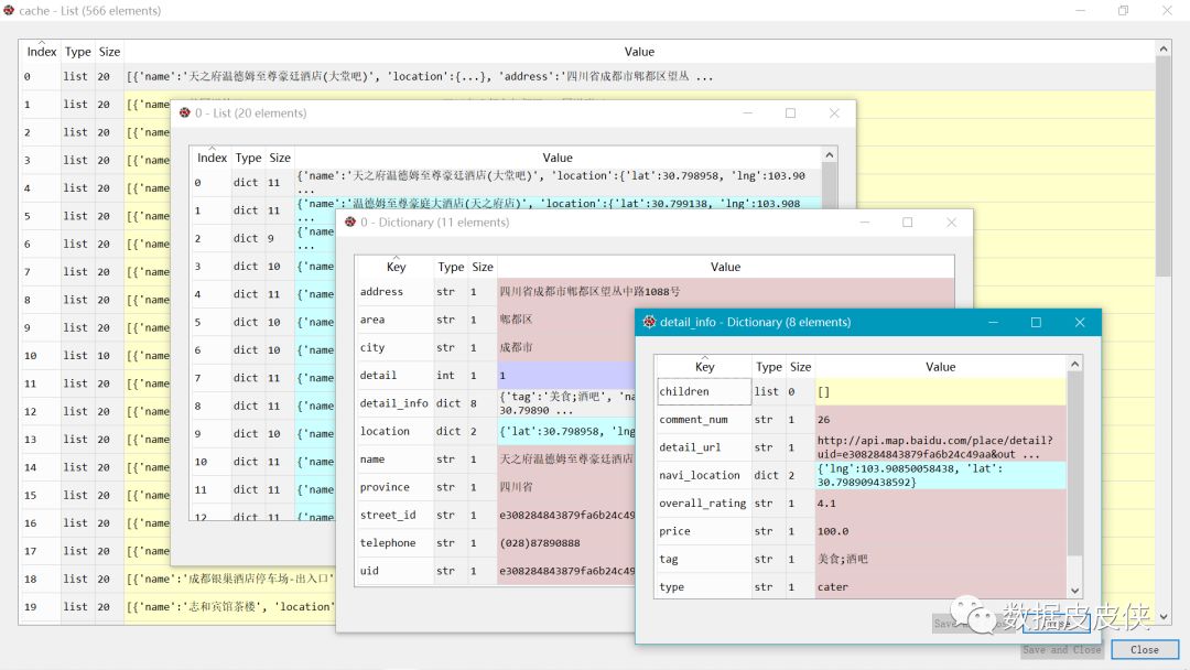 本案例通过API和网页分析实现了对百度地图POI数据的爬取,获取了成都市地区的POI数据,并且重点分析了爬取得到的酒店数据,分析酒店分布特点给出了统计分析的结果以及实现了数据的可视化。