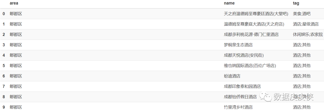 清洗后数据的格式,数据一共有三列,第一列表示酒店对应的区域即具体所在哪个区,第二行表示酒店的名称,第三列表示酒店的分类(粗略分类)。