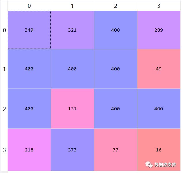 图3中每个矩形单元格表示一个矩形选区,对应的数字表示该选区内的返回POI数目。通过上图3可以知晓,对1成都市的矩形访问选区内,使用4X4切割得到的数据分布情况,在选区中部数据大多为400,说明该部分数据还没有完全返回,该部分地区酒店较为集中。单次切割不能返回全部数据全部。