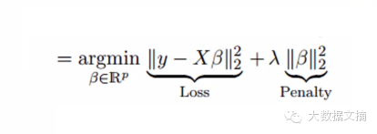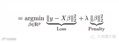 在这个公式中,有两个组成部分。第一个是最小二乘项,另一个是β2(β-平方)的λ倍,其中β是相关系数。为了收缩参数把它添加到最小二乘项中以得到一个非常低的方差。