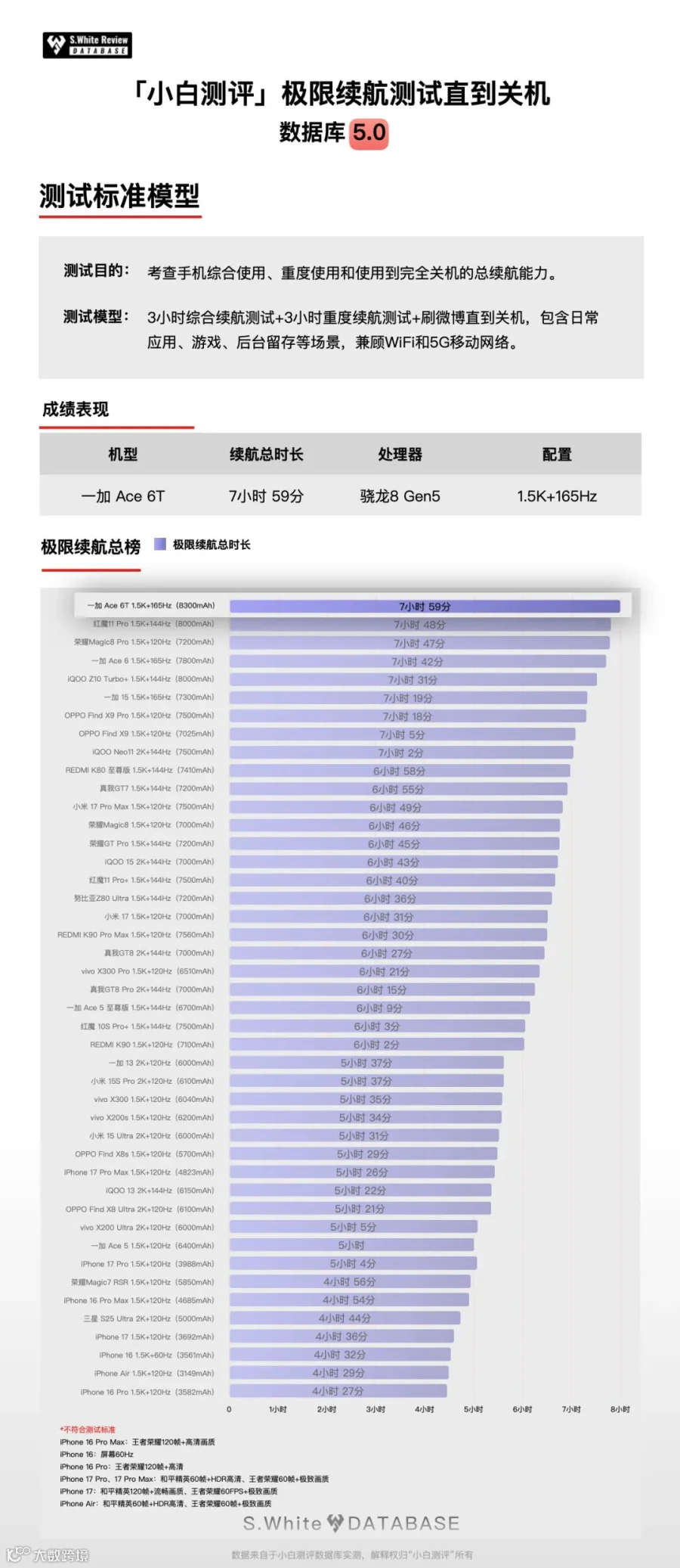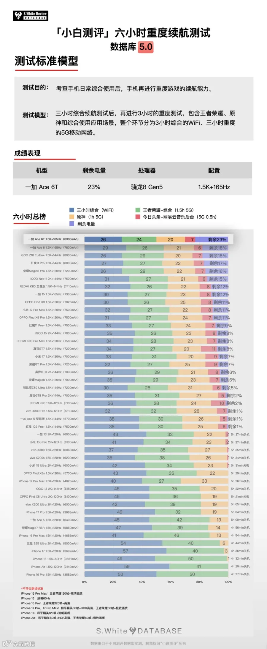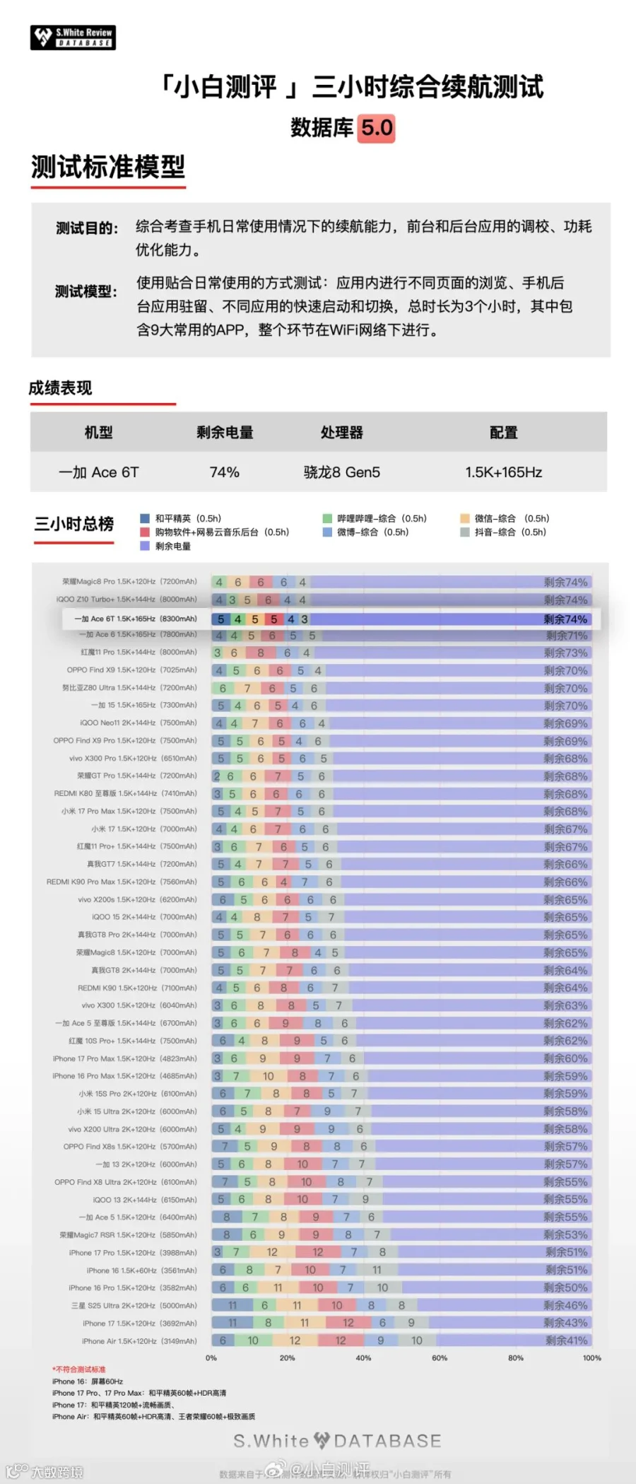 测试时全程亮屏,项目包含应用内、后台留存、应用启动和应用切换等日常使用场景,以及负载高的游戏场景,一加 Ace 6T的综合续航能力优秀,其中在【六小时重度续航】和【极限续航测试直到关机】测试中获得第一,在【三小时综合测试】获得第三。(续航模型的详情请参考配图)