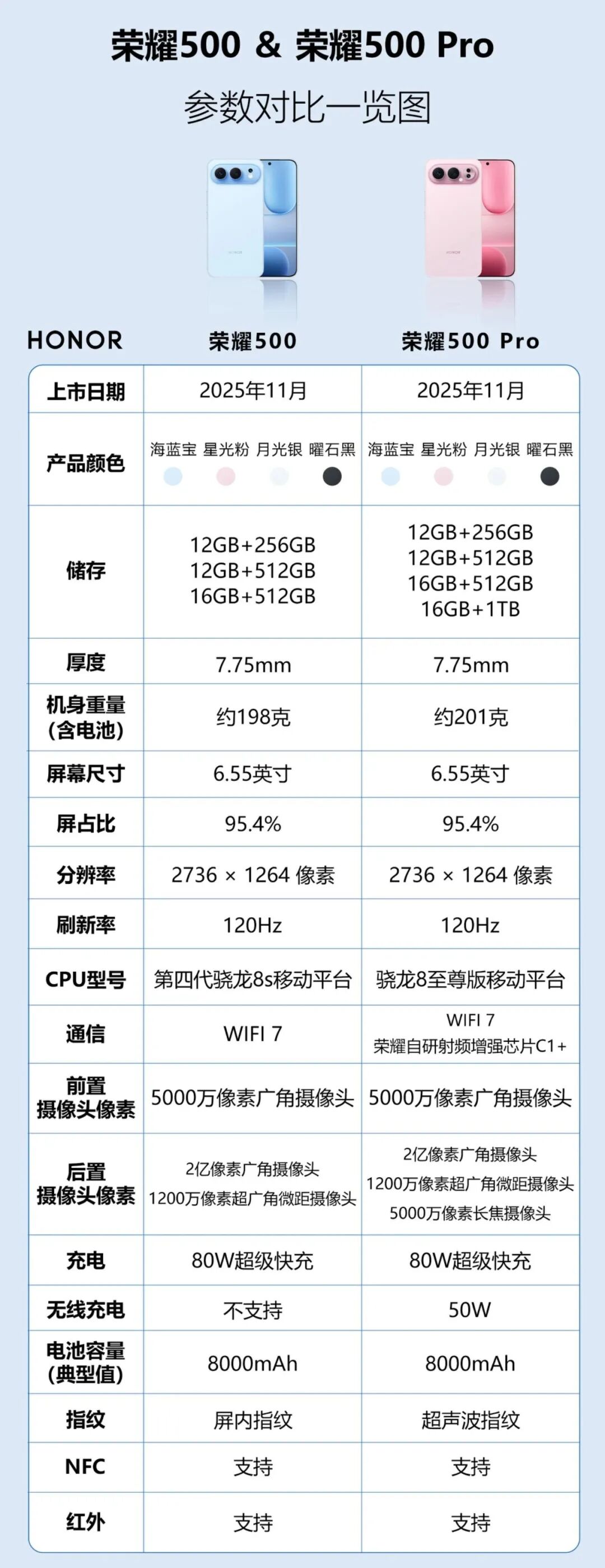 作为补充,【荣耀500】12+256GB版售价2699元,12+512GB版2999元,16+512GB版3299元;【荣耀500 Pro】12+256GB版售价3599元,12+512GB版3899元,16+512GB版4199元,16GB+1TB版4799元。有入手的吗?