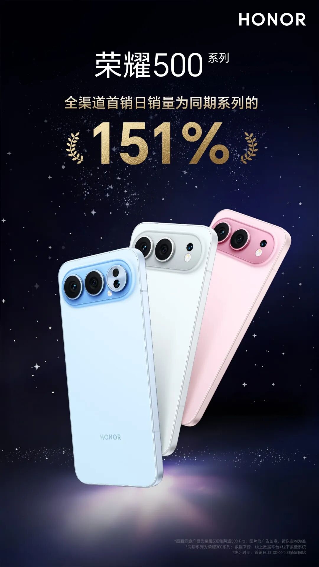 据荣耀终端股份有限公司产品总裁方飞在微博晒出的海报显示,荣耀500系列全渠道首销日销量为同期系列的151%。