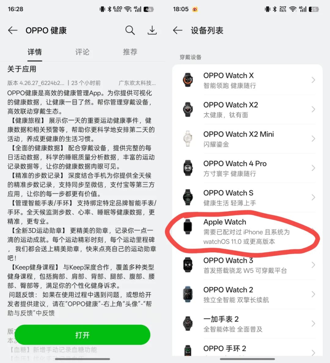 如上图所见,OPPO手机在应用商店更新“OPPO健康”时显示:支持绑定特定品牌的智能手表/手环,更新后在“OPPO健康”中设备列表新增Apple Watch。