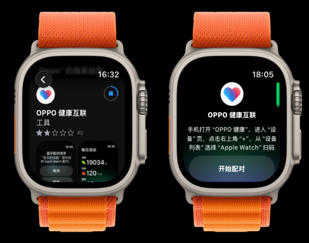 给Apple Watch下载安装“OPPO健康互联”App,打开后可以看到会提醒:(OPPO)手机打开“OPPO健康”,进入“设备”页,点击右上角“+”,从“设备列表”选择“Apple Watch”扫码蓝牙配对即可使用。