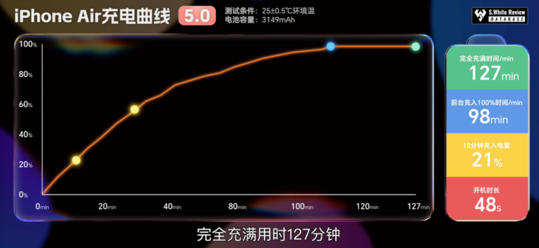 充电表现上,iPhone Air完全没电插线后到开机用时48s,10分钟充入电量21%,前台充入100%用时98分钟,完全充满用时127分钟。以上基于