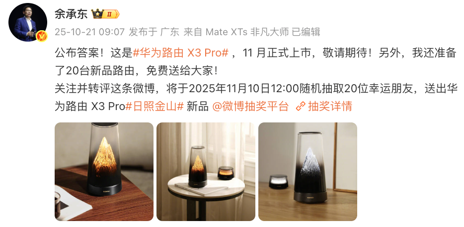 如上图所见,余承东晒出一款路由器新品——华为路由X3 Pro,外观看起来非常有设计感,像日落金山一样,似乎还可以设定金色或者白色,预热将在11月正式上市,或许Mate 80系列一起?🤔