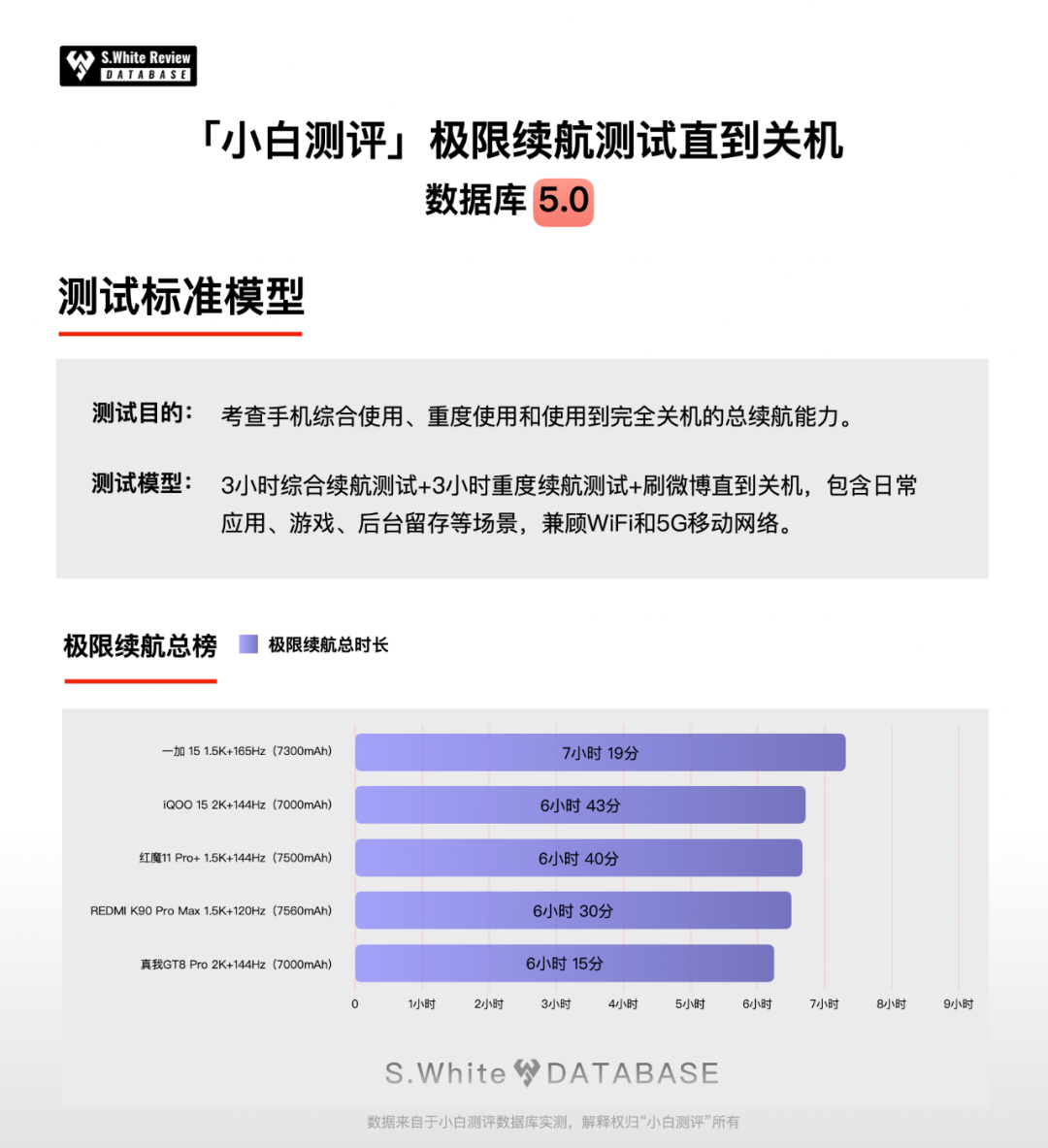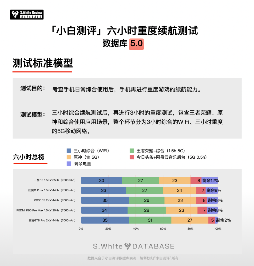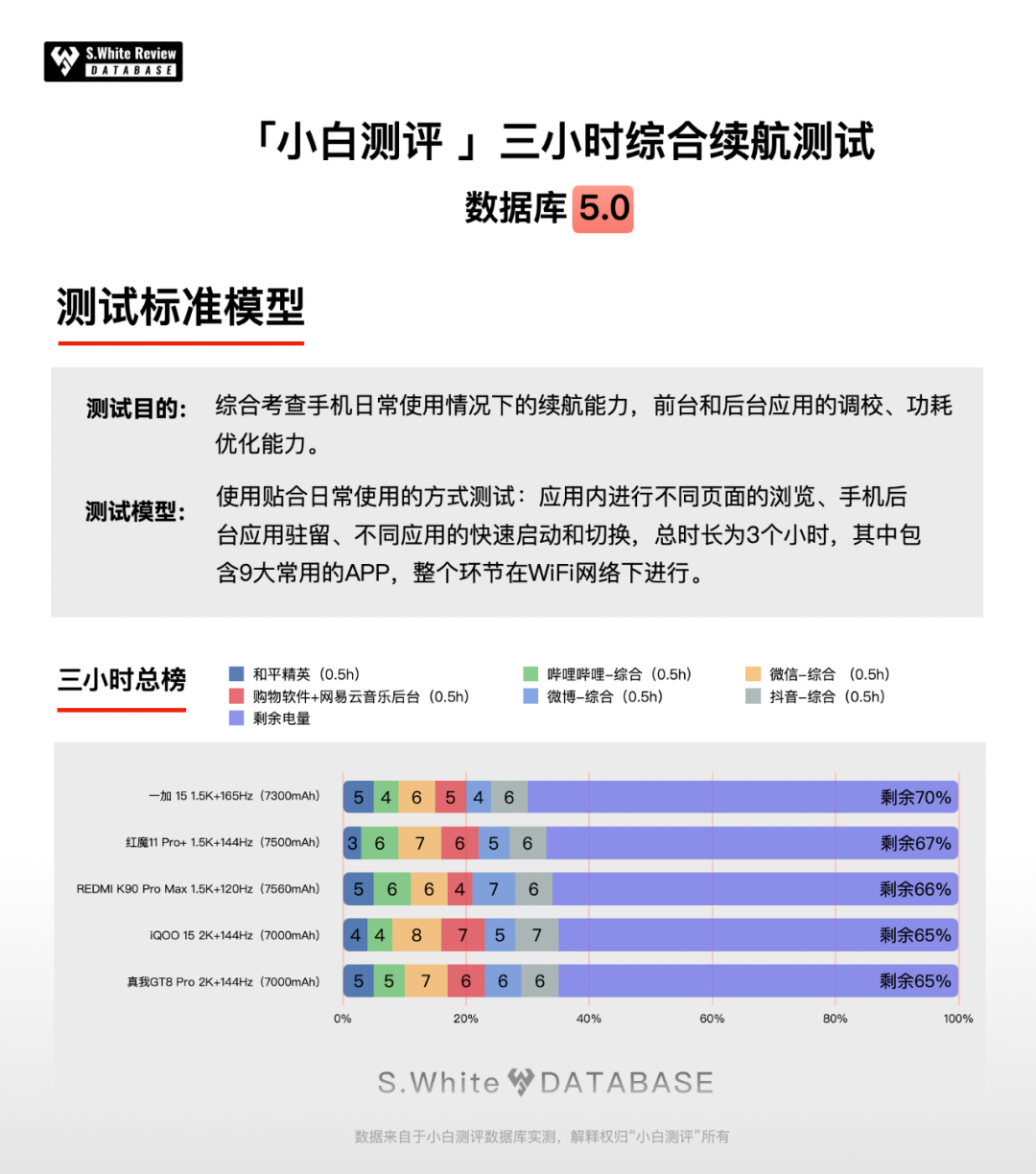 小白测评数据库5.0模型下三小时综合续航:剩余电量都在65%及以上,其中一加15剩余电量最多是70%;