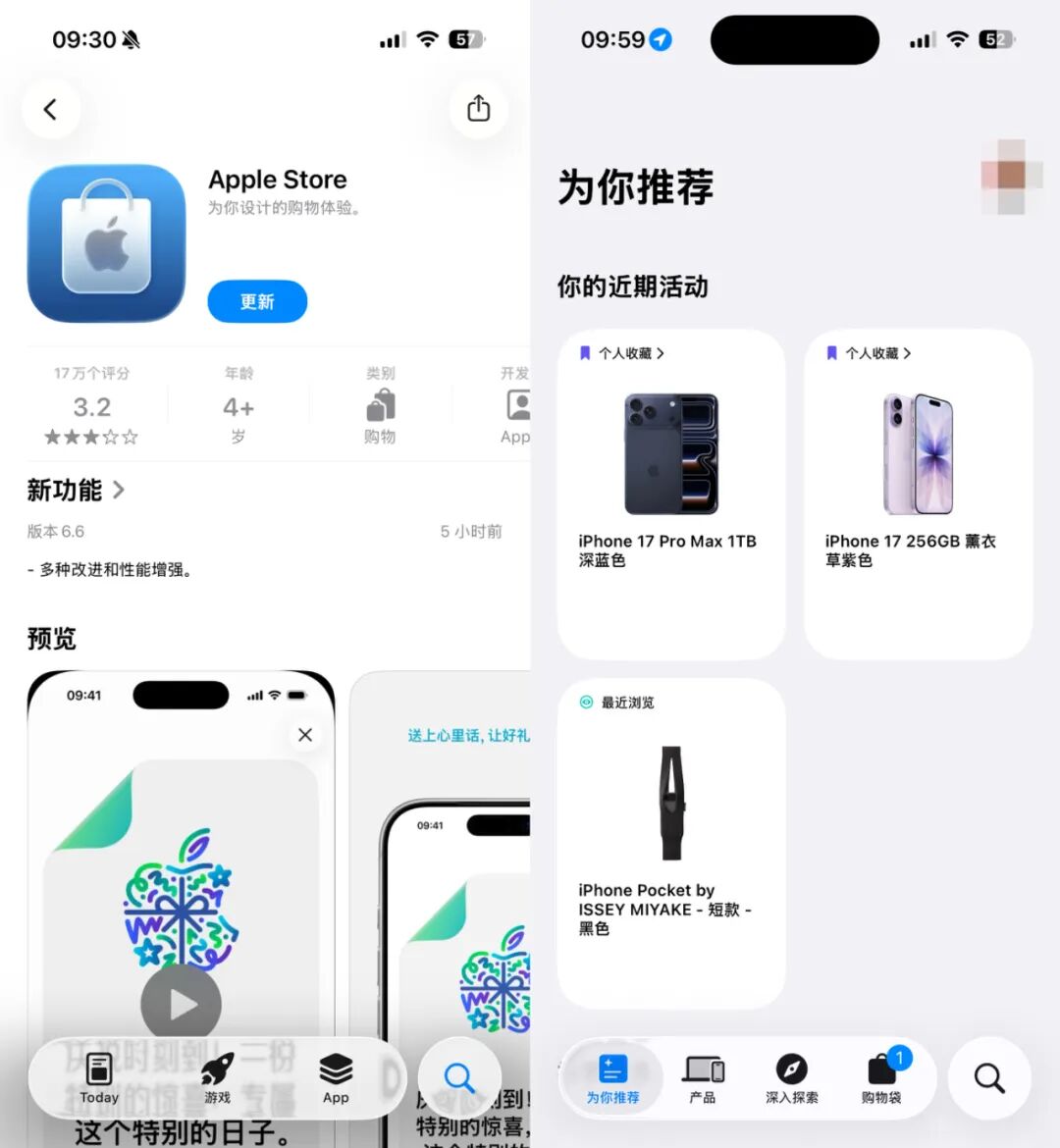 如上图所见,Apple Store更新至6.6版本后图标变成深蓝色底+苹果logo的白色手提袋组合,更新后应用主页底部呈现出和iOS 26设计主题相似的的液态玻璃效果。