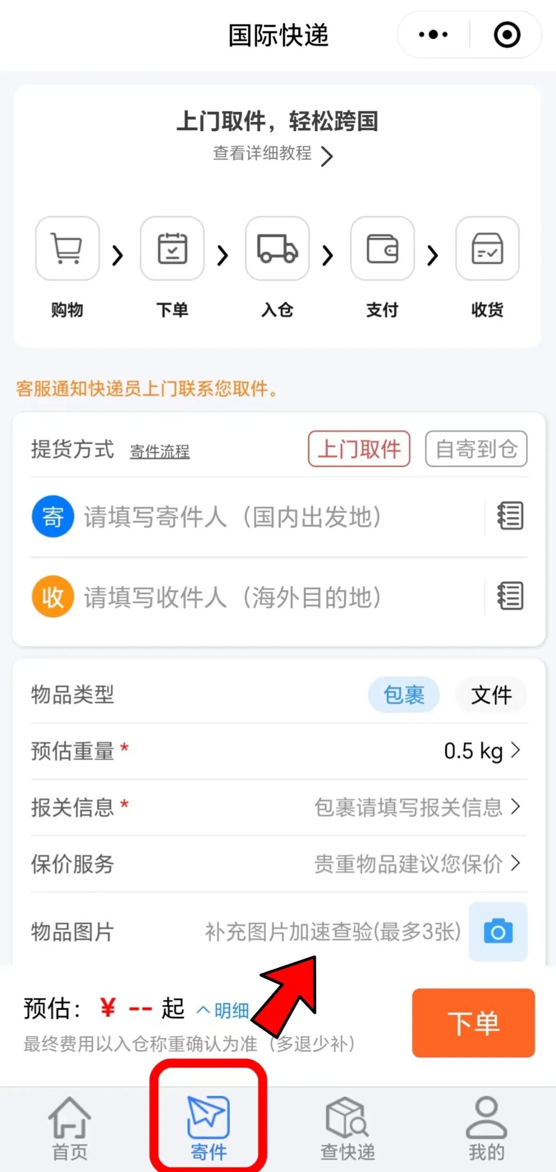点击底部“寄件”,填写相关信息,确认无误并提交订单后,将会有专业客服为您服务,待快递员上门开箱查验并测量计费,后续等着清关派送就行啦