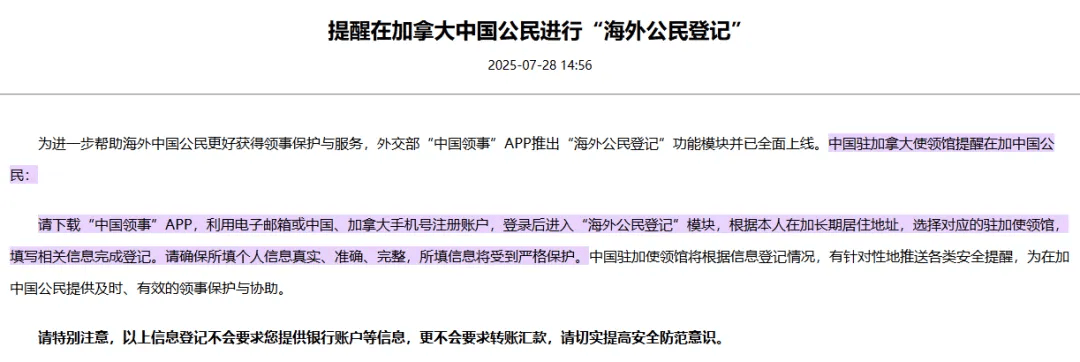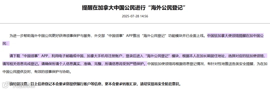 7月28日,中国驻加拿大大使馆发布重要通知,呼吁所有在加中国公民通过“中国领事”APP完成 “海外公民登记”。这一举措旨在为海外同胞构建更完善的安全防护网,确保在紧急情况下能及时获得领事保护与协助。